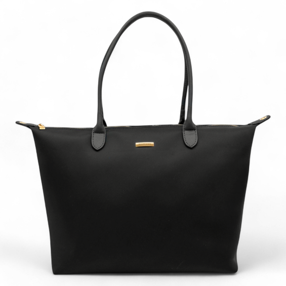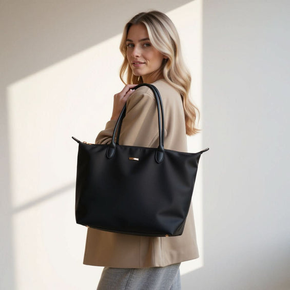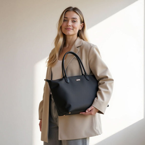 Unsere Nayla Handtasche vereint schlichte Eleganz mit praktischer Vielseitigkeit. Ihr modernes, minimalistisches Design in einem eleganten schwarz macht sie zu einem stilvollen Begleiter für jeden Tag. Das hochwertige Material überzeugt durch seine leichte, strapazierfähige Beschaffenheit und sorgt dafür, dass die Tasche nicht nur gut aussieht, sondern auch lange hält.