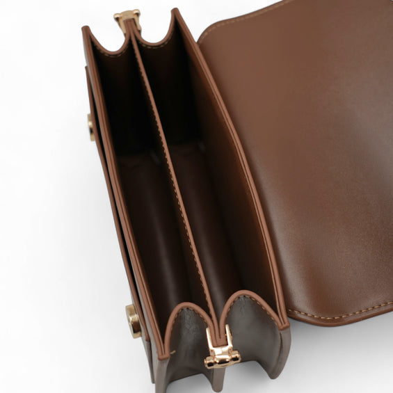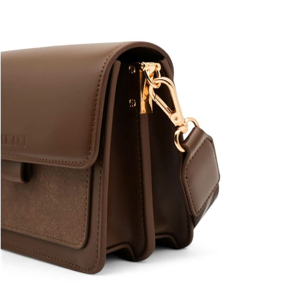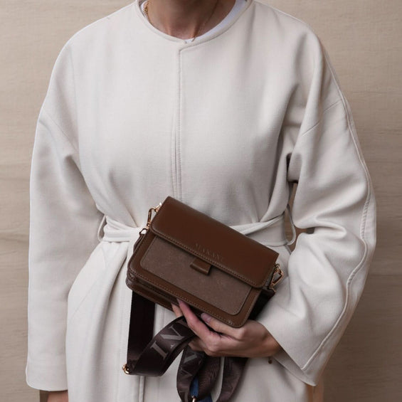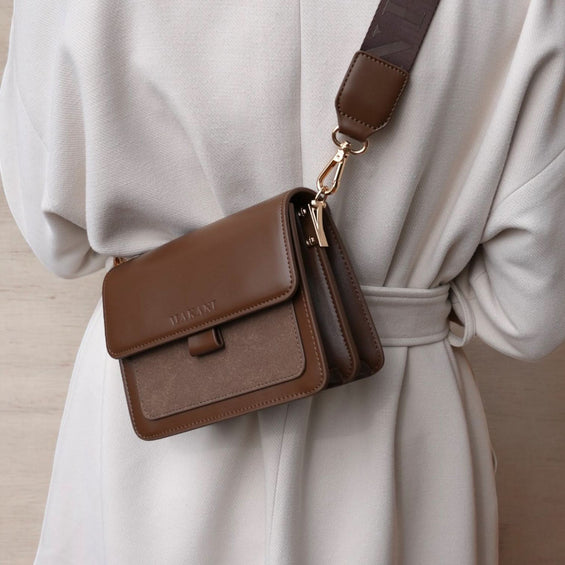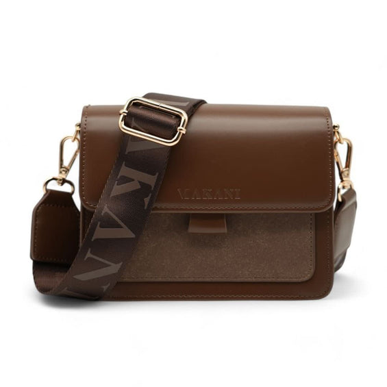 Für die modebewusste Frau ist die Handtasche "VALDA" in der Farbe Dank Brown ein unverzichtbares Alltagsaccessoire. Das vegane PU-Glattleder überzeugt mit einer attraktiven Optik sowie einer hohen Widerstandsfähigkeit. Goldene Details aus Messing komplettieren den eleganten Gesamteindruck der Handtasche. Mit einem attraktiven Muster und einer Breite von vier Zentimetern ermöglicht der längenverstellbare Umhängegurt nicht nur einen hohen Tragekomfort, sondern dient zugleich als optischer Blickfang. Der Magnetverschluss bietet eine einfache Bedienung und schließt die Tasche gleichzeitig zuverlässig. Selbstverständlich bietet die Handtasche viel Stauraum für die wichtigen Accessoires. Portemonnaie, Schlüssel und Smartphone finden in insgesamt zwei Innenfächern und einem Außenfach einen sicheren Platz.