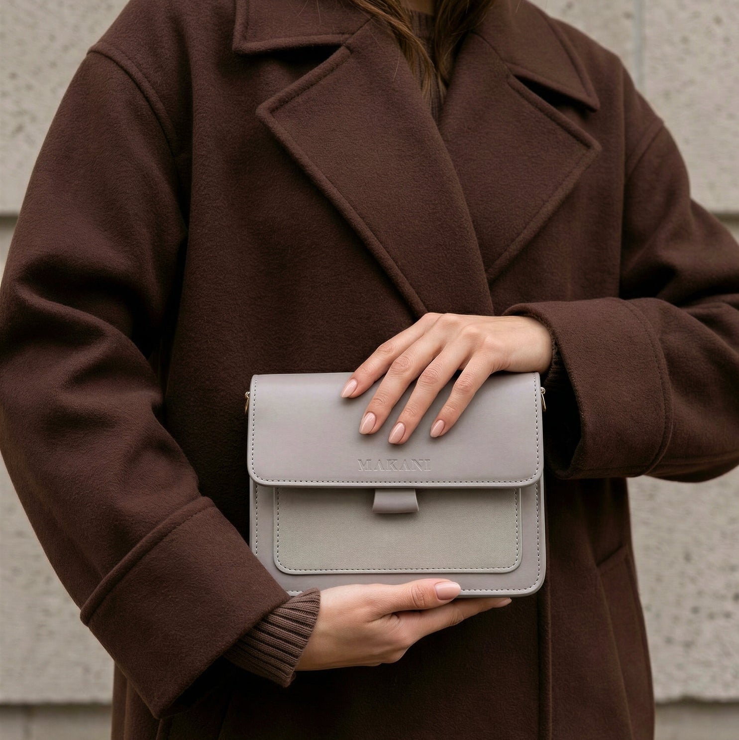 Für die modebewusste Frau ist die Handtasche "VALDA" in der Farbe Taupe ein unverzichtbares Alltagsaccessoire. Das vegane PU-Glattleder überzeugt mit einer attraktiven Optik sowie einer hohen Widerstandsfähigkeit. Goldene Details aus Messing komplettieren den eleganten Gesamteindruck der Handtasche. Mit einer Breite von vier Zentimetern ermöglicht der längenverstellbare Umhängegurt nicht nur einen hohen Tragekomfort, sondern fungiert zugleich als optischer Blickfang dank dem auffälligen MAKANI Aufdruck. Der Magnetverschluss bietet eine einfache Bedienung und schließt die Tasche gleichzeitig zuverlässig. Selbstverständlich bietet die Handtasche viel Stauraum für die wichtigen Accessoires. Portemonnaie, Schlüssel und Smartphone finden in insgesamt drei Innenfächern und einem Außenfach einen sicheren Platz. Das mittlere Innenfach verschließen Sie bei Bedarf sicher mit dem Reißverschluss.