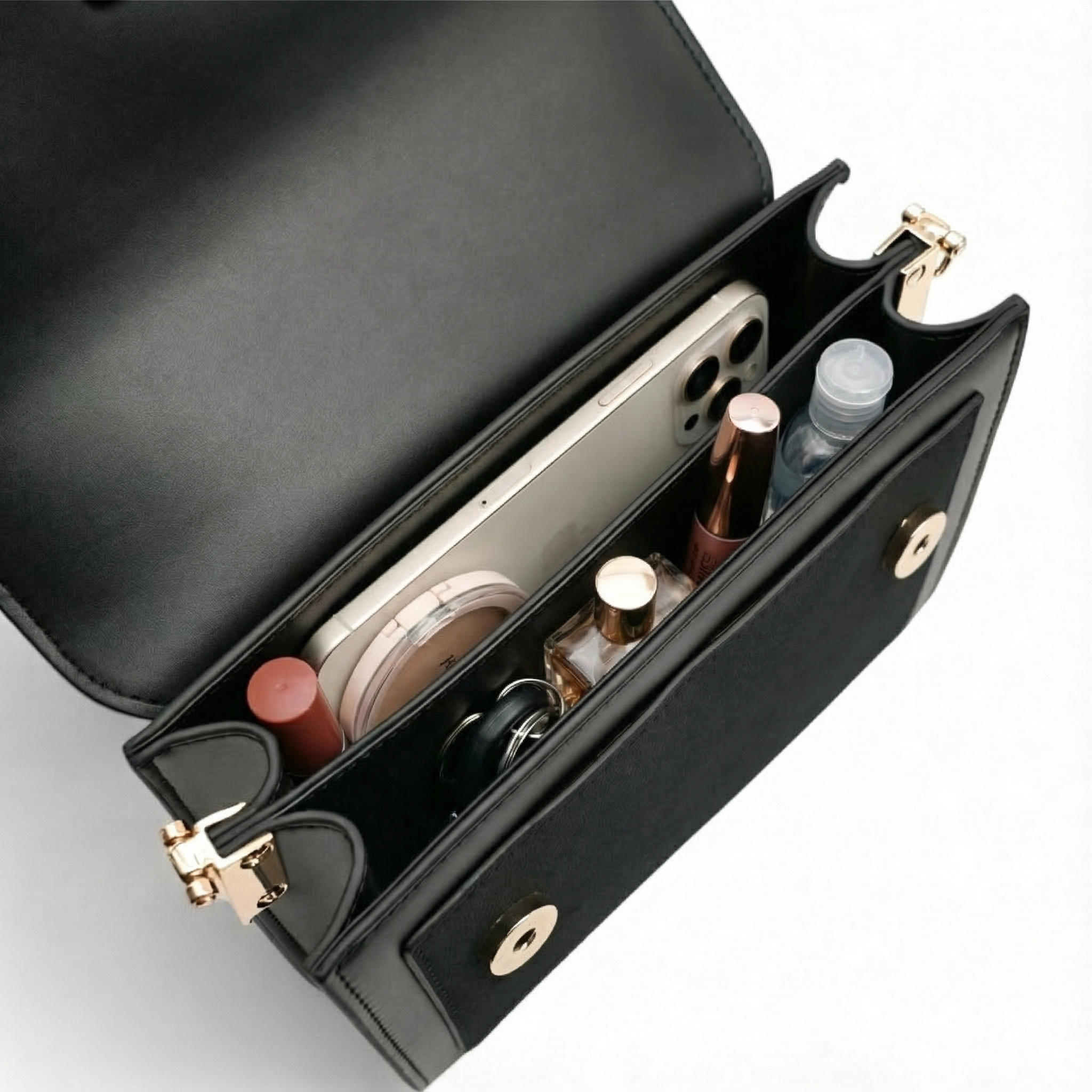 Für die modebewusste Frau ist die Handtasche "VALDA" in der Farbe Schwarz ein unverzichtbares Alltagsaccessoire. Das vegane PU-Glattleder überzeugt mit einer attraktiven Optik sowie einer hohen Widerstandsfähigkeit. Goldene Details aus Messing komplettieren den eleganten Gesamteindruck der Handtasche. Mit einem attraktiven Muster und einer Breite von vier Zentimetern ermöglicht der längenverstellbare Umhängegurt nicht nur einen hohen Tragekomfort, sondern dient zugleich als optischer Blickfang. Der Magnetverschluss bietet eine einfache Bedienung und schließt die Tasche gleichzeitig zuverlässig. Selbstverständlich bietet die Handtasche viel Stauraum für die wichtigen Accessoires. Portemonnaie, Schlüssel und Smartphone finden in insgesamt zwei Innenfächern und einem Außenfach einen sicheren Platz.